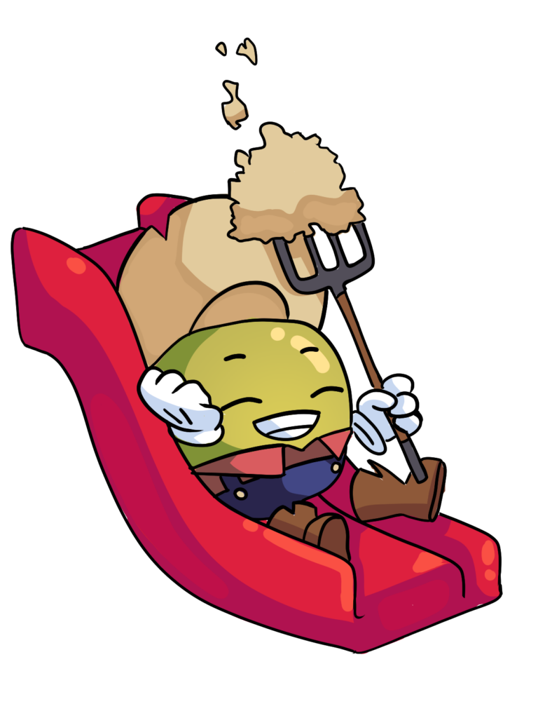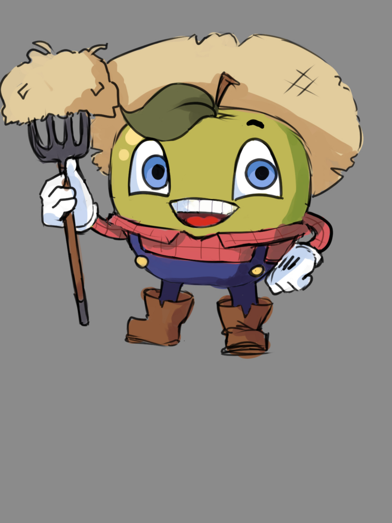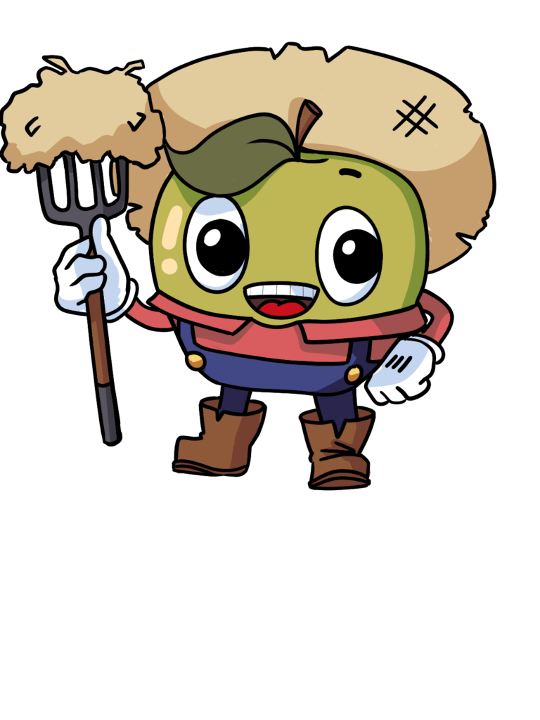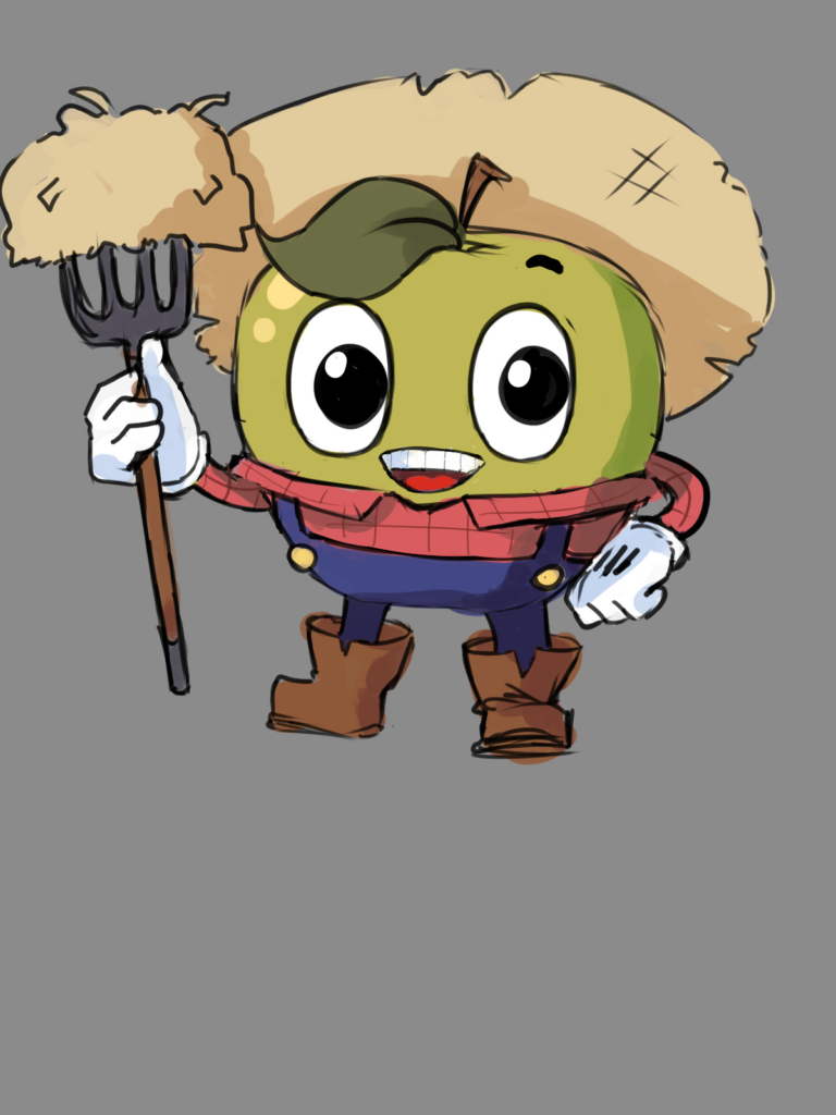 A cartoon green Apple farmer mascot, a clean reference and a sticker design.